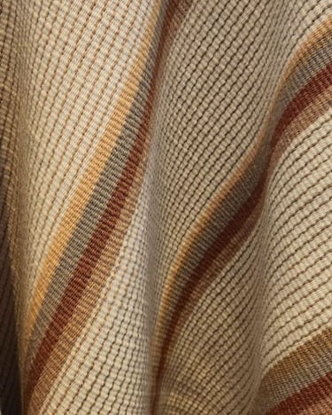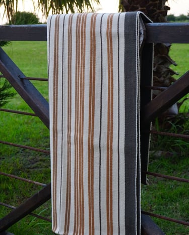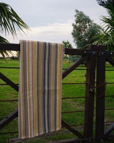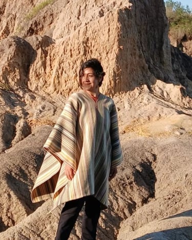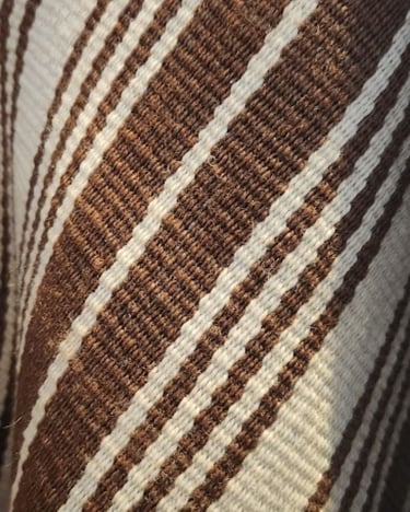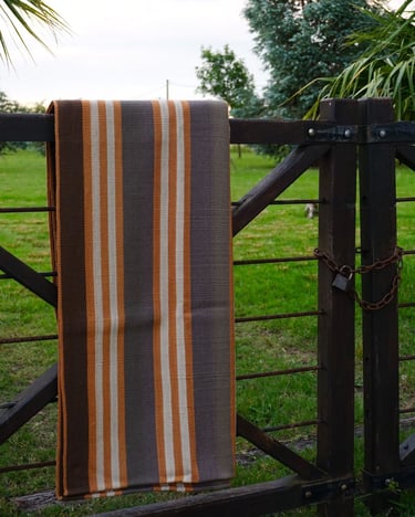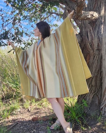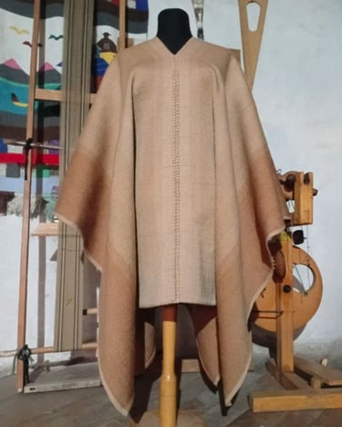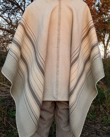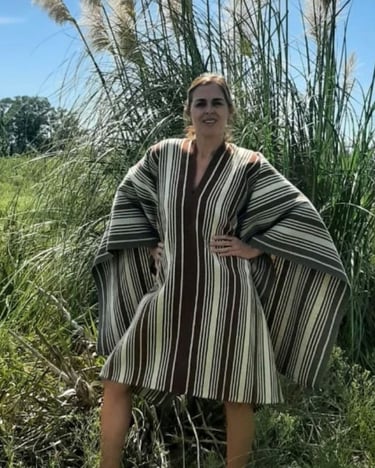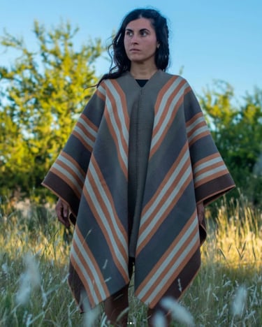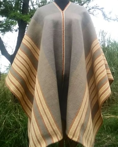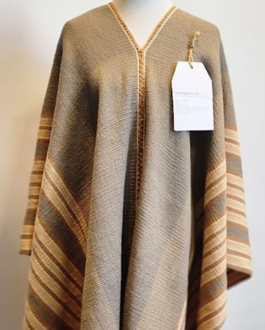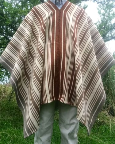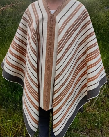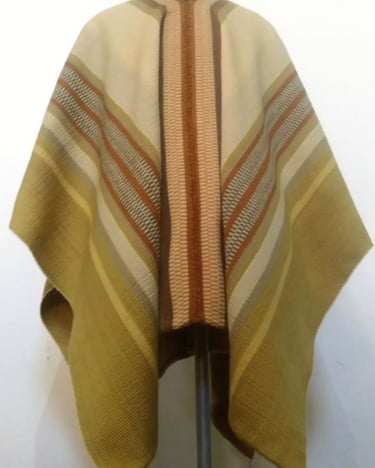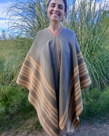 Poncho tejido en telar criollo, listado de dos paños, unido por costura bordado tradicional. 100% lana, tintes naturales de espinillo y eucalipto con mordiente de sal gruesa. 100% lana. Participante en la convocatoria del Salón de Creatividad y Diseño Artesanal 2025 y le fue otorgado el 1er Premio en Fibras Animales Tradicional, Textilería Ponchos.