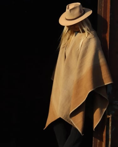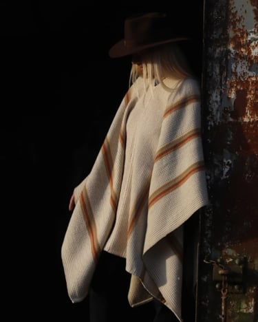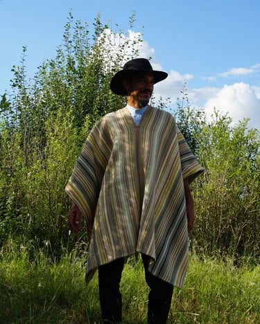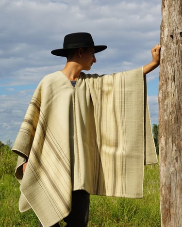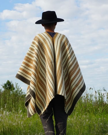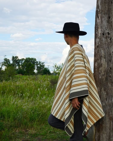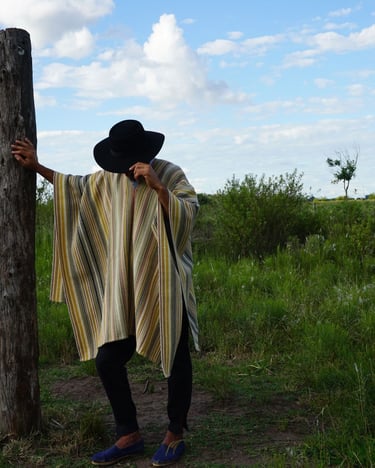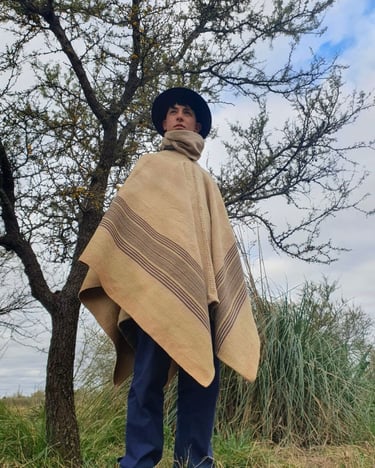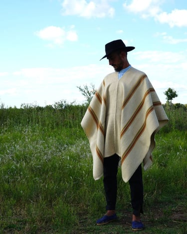 Mirando hacia el pasado para ser fiel a un estilo local y tradicional, encontré inspiración en pintores costumbristas como Rodolfo Ramos, a quien lamento no haber llegado a conocer. Poncho 100% lana. Tintes naturales locales de San Antonio de Areco. Tejido en Telar Criollo.
