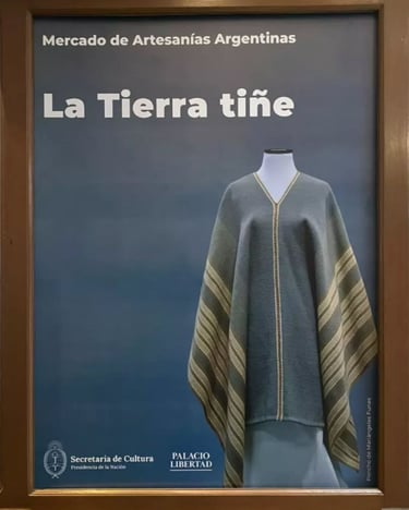 Poncho expuesto y destacado en el Mercado de Artesanías Argentinas - La Tierra Tiñe 2025 en el Palacio Libertad. Tejido en Telar Criollo. 100% de lana, tintes naturales.